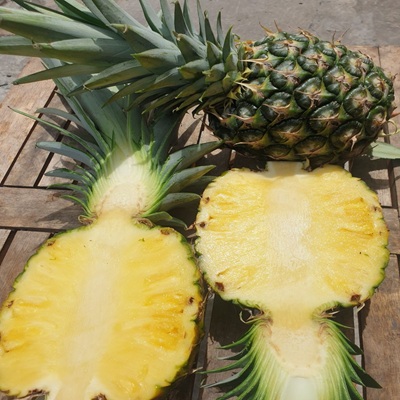Pineapple features a golden-yellow flesh protected by a textured outer skin and topped with a fresh green crown. The fruit delivers a perfect balance of sweetness and mild acidity with a fragrant tropical aroma. Dứa có phần ruột vàng óng, lớp vỏ ngoài đặc trưng và chóp lá xanh tươi. Hương vị cân bằng giữa ngọt và chua nhẹ cùng mùi thơm nhiệt đới hấp dẫn.